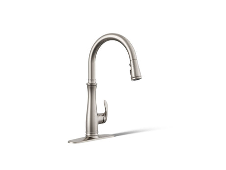 Touchless pull-down kitchen sink faucet with three-function sprayhead